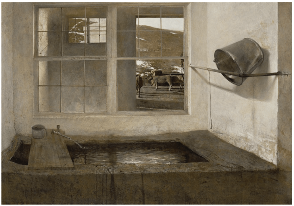 Another example of his twist on reality is in his highly detailed work titled “Spring Fed” (1967). Unlike a photograph that will always have regions outside of the focal plane due to limitations of light and optics, Wyeth carries sharp detail from the stone sink in the foreground to the grazing cows in the far depth of the scene. This allows us as a viewer to exchange focus on the foreground and background at will, as we would experience a scene in real life, without having our views framed or forced into a narrow perspective. But Wyeth does frame a view for us, as an open doorway shows us cows standing in the distance. The cows aren’t grazing; the grass around them is brown, and there are ribbons of snow in the hillside beyond. It is winter once more in Wyeth’s world, and we can’t help but wonder why the cows aren’t in hunkered down in the barn for the winter. The cows are looking off at something we can’t see; perhaps they are being sold and sent off to another farm. Perhaps they are being purchased and sent to slaughter. We turn our attention away, further studying the detail of a shiny bucket propped near the stone sink. One can’t help but to squint at the reflections in the bucket to see if a glimpse of the artist can be caught. Alas, none can be found, reminding us that this not a depiction of reality but instead a story that Wyeth is weaving together for the viewer.