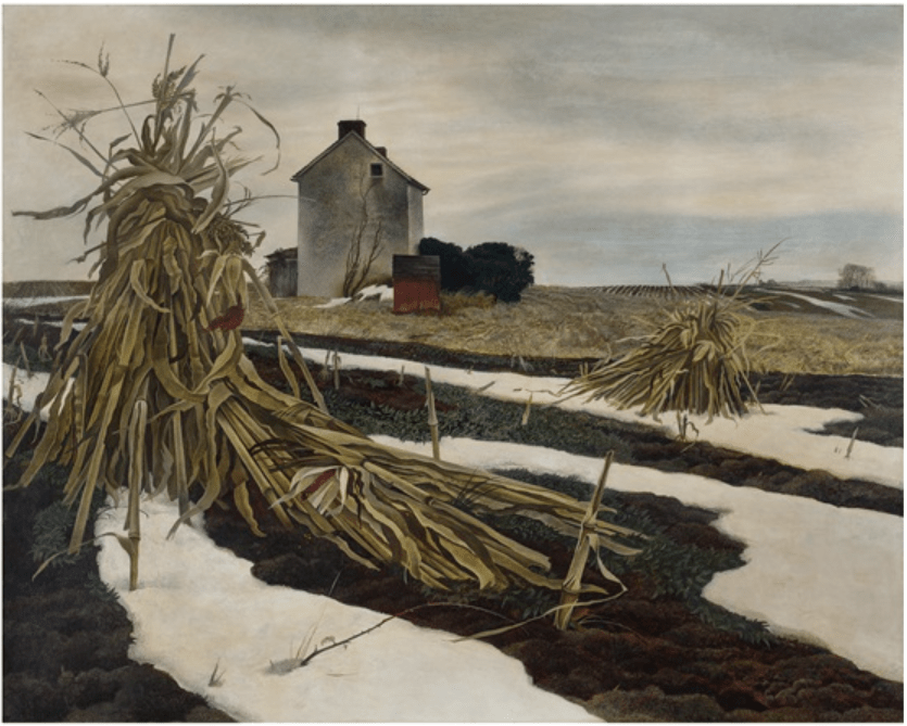 Take for instance, his painting titled “Winter Fields” (1942). On a walk near his home, Wyeth found a crow frozen in a field and brought it home to paint in exquisite detail. He paints the crow in the foreground of a sweeping hillside of dormant prairie grass and harvested grain sheaves. In the far distance is a farmhouse and barn, some craggy leafless trees, and the suggestion of a forest line. The scene looks almost like a photograph, but he paints the bird in a perspective that brings the viewer’s eye to ground level. This perspective is completely unnatural, as a person would need to be standing in a hole to achieve this vantage point. Wyeth is depicting the cold inevitability of death, and has his viewer standing in the ground that this crow, and all of us, will eventually return to as dust.